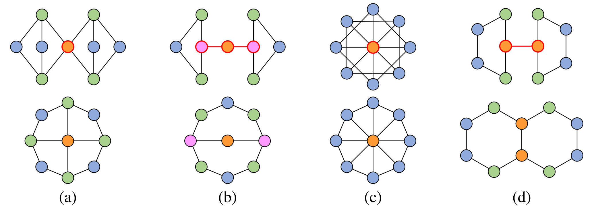 绝大多数图神经网络无法区别上面的4组图中双连通性的差异