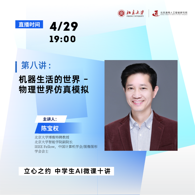 直播简介:“实践出真知”成就了人类的高级智能,也是机器获取智能的有效途径。但与人不同,机器在真实场景中的探索实践非常费钱、费时、费力。是否可能为机器构建一个类比现实世界的“玩耍“空间?且听微课第八讲:机器生活的世界——物理世界仿真模拟。