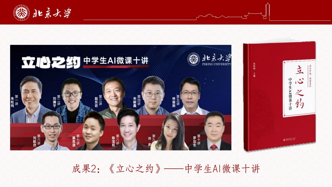 北大智能学院、北京通用人工智能研究院联合发布“《立心之约》微课十讲”,20余位专家组成教学团队,浓缩凝练北大人工智能本硕博课程体系30余门核心课程,推出全国首套面向中小学生的公开视频课程,面向中小学生发出“立心”邀约。课程2023年首播即突破千万观看量,次年入选教育部“名师教AI”专栏。2025年,这门备受瞩目的视频课程以图书形式出版