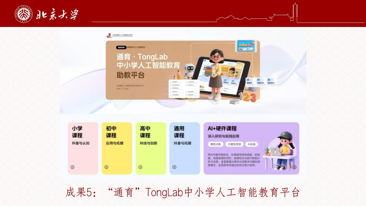 北京通用人工智能研究院与北大智能学院联合发布“通育”中小学人工智能教育平台,依据学生认知特点与课程要求,提供适配性强、科学性的教学工具:小学阶段通过零门槛、游戏化体验激发兴趣;初中阶段以项目式学习培养工程思维;高中阶段提供体系化前沿课程引导创新实践。同时,强大的助教平台赋能教师,提供智能教案生成、AI出题、作文批改、数字人预习等工具,显著提升教学效率。